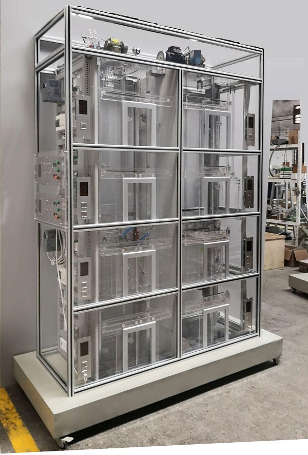 電梯教學(xué)模型是根據(jù)最常見的升降式電梯結(jié)構(gòu),采用透明有機(jī)材料制成,其結(jié)構(gòu)與實(shí)際電梯完全相同,且?guī)缀蹙邆淞藢?shí)際電梯的所有功能。電梯模型大部分部件均是采用透明有機(jī)材料制成,使得電梯的內(nèi)部結(jié)構(gòu)一目了然;同時(shí),電梯的運(yùn)行過程,以及每個(gè)動(dòng)作都十分明了,且可以反復(fù)實(shí)際動(dòng)手操作。使學(xué)生能夠很直觀、透徹地了解、掌握電梯的結(jié)構(gòu)及其動(dòng)作原理,達(dá)到事半功倍的效果。解決了以往電梯教學(xué)中單純的理論教學(xué)方式或是參觀實(shí)際電梯時(shí)所帶來的不安全,無法全面了解其內(nèi)部結(jié)構(gòu)及運(yùn)行過程等種種實(shí)際問題。