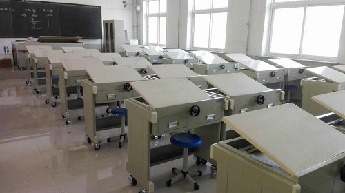 工程制圖實(shí)驗(yàn)室是理工科主要的技術(shù)基礎(chǔ)課.如何更快地培養(yǎng)學(xué)生的空間思維能力,更有效地掌握繪圖基本功,這是廣大師生多年愿望。該制圖桌采用鋼木結(jié)構(gòu),桌面可調(diào)節(jié)傾角、工作臺(tái)下面抽屜供放學(xué)習(xí)資料工具書等功能。