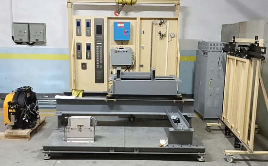 曳引系統(tǒng)采用真實電梯曳引機,按照真實電梯的安裝方式安裝在機械框架上,機械框架由腳輪可變換場地位置。還配備的機械可移動式吊架,可對曳引機進(jìn)行維修、調(diào)整、安裝保養(yǎng)等項目的操作。