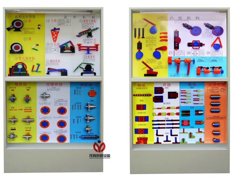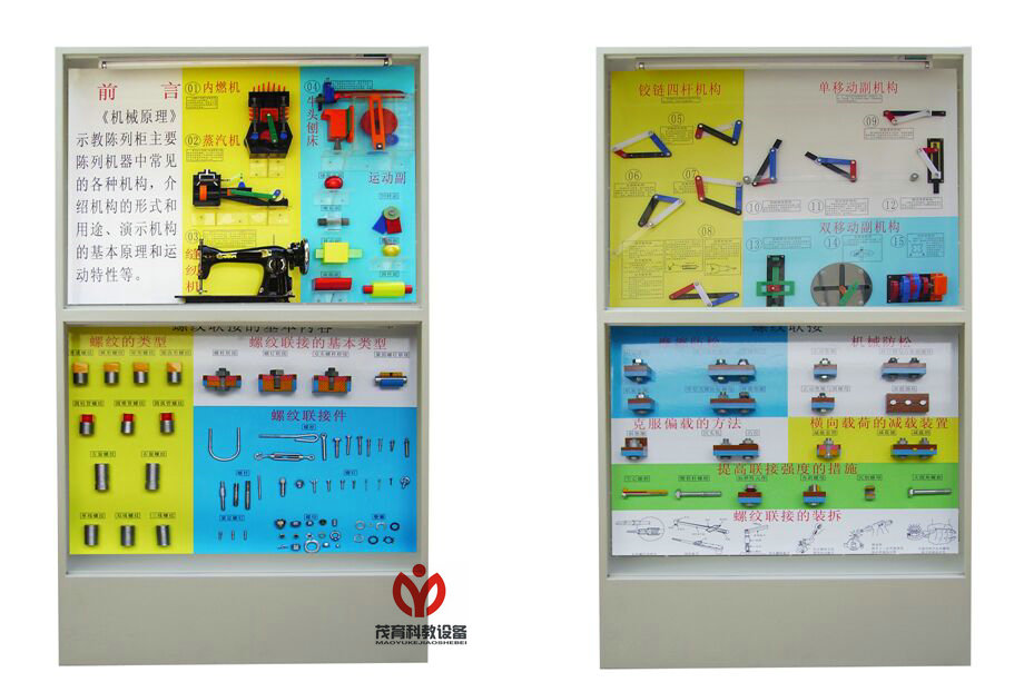 是根據大、中專院校、技校、職業(yè)學校的機械原理教學大綱而設計的電化教學設備。所展示的模型采用遙控任意選者進行單獨演示,模型材料采用進口有機板和硬聚氯制作而成,板面面板采用高強度室外寫真覆壓膜材料為底色,圖表和文字說明直接制作在上面。每個