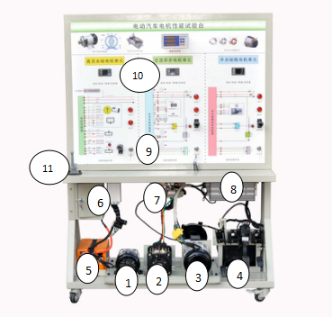 純電動(dòng)汽車電機(jī)性能實(shí)驗(yàn)臺部件說明:1-直流永磁電機(jī);2-交流異步電機(jī);3-開關(guān)磁阻電機(jī);4-電池組;5-電池組;6-直流永磁電機(jī)控制器;7-交流異步電機(jī)控制器;8-開關(guān)磁阻電機(jī)控制器;9-原理面板;10-電壓電流表、轉(zhuǎn)速表、扭矩表、功率表;11-電源總開關(guān);