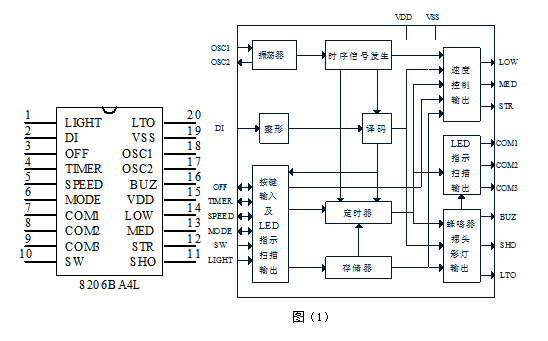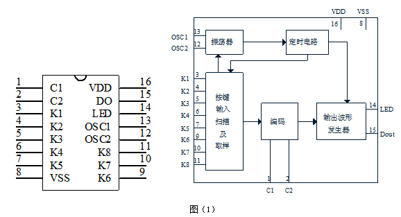 LX5104是一款紅外編碼電路,采用CMOS工藝制造。該芯片共有8個按鍵,每個按鍵發(fā)一組碼(共能發(fā)8組碼)。雙鍵或多鍵發(fā)的碼視為無效碼。每按一次鍵,保證至少發(fā)兩幀碼。特點為:工作電壓范圍寬(Vdd=2.0V~5.0V),按鍵起振功耗低,外圍元器件少,2位可調(diào)整用戶碼可以用于不同點機型,38kHz載波紅外線訊號發(fā)射輸出,LED輸出顯示發(fā)射狀態(tài),發(fā)射信號高達8個通道,高噪聲抑制能力。芯片管腳定義及內(nèi)部框圖如下圖(1):