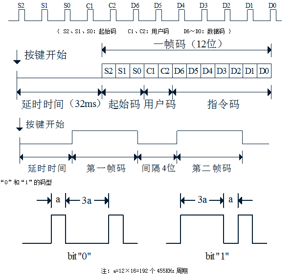傳送碼的格式是一個12位的字,由三位起始碼(110),兩位用戶碼(C1、C2),七位數(shù)據(jù)碼組成。
