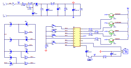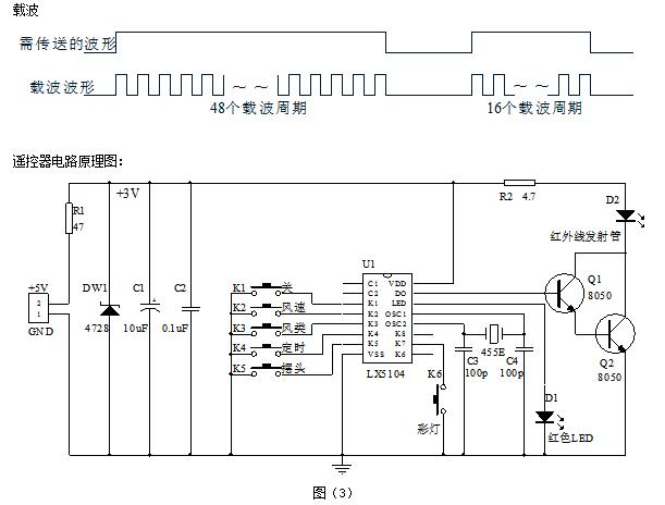 AWJD01掛件上半部分為遙控器部分,模擬手持遙控器,5V經(jīng)穩(wěn)壓成3V供電,5104芯片編碼,按鍵操作選擇不同編碼組合,按鍵有效指示,編碼信號經(jīng)放大后由紅外發(fā)射管發(fā)射。
