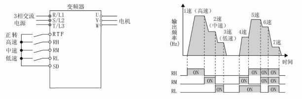②設(shè)定“高速頻率”Pr4為40,“高中速頻率”Pr5為30,“低速頻率”Pr6為20,