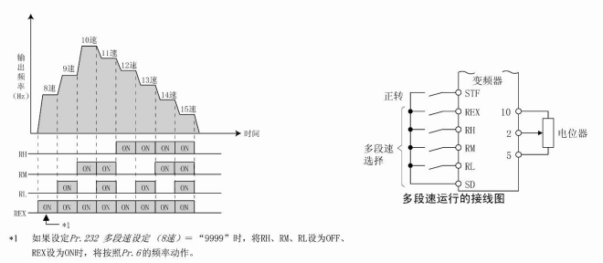 通過RH、RM、RL、REX信號(hào)的組合,可以設(shè)定4速~15速。請(qǐng)?jiān)赑r.24~Pr.27、Pr.232~Pr.239 中設(shè)定運(yùn)行頻率(初始值狀態(tài)下4速~15速為無法使用的設(shè)定)。