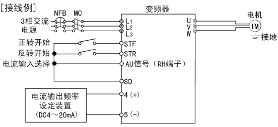 電源是使用變頻器內(nèi)置電源,還是使用外部電源。使用內(nèi)置電源時(shí)端子10-5間輸出DC5V。