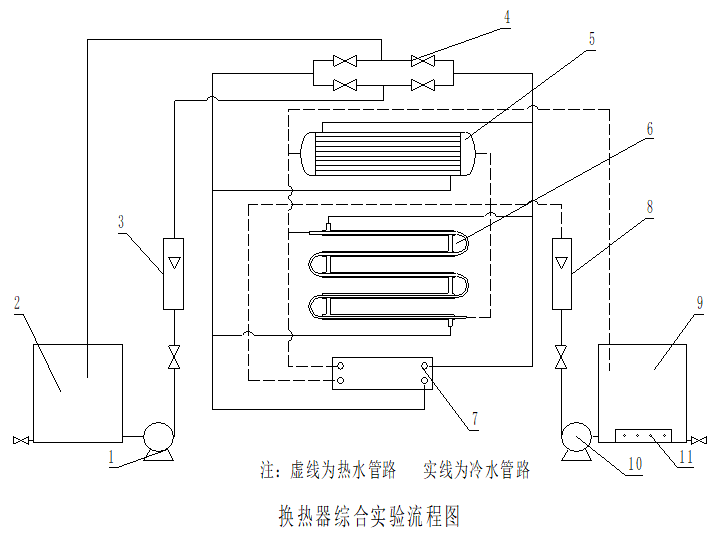 1.冷水泵 2冷水箱 3.冷水流量計 4.冷水順逆流閥門組 5.列管式換熱器 6.套管式換熱器 7.板式換熱器 8.熱水流量計 9.熱水箱 10. 熱水泵 11 電加熱器 巡檢儀溫度顯示:T1-熱水進口溫度;T2-熱水出口溫度; T3-冷水進口溫度;T4-冷水出口溫度