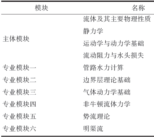為體現(xiàn)各專業(yè)的授課內容能更有利于以后在專業(yè)課上的應用,特將授課內容分成主體模塊和不同專業(yè)模塊,將主體模塊與不同專業(yè)模塊組合到不同專業(yè),以體現(xiàn)課程的“專業(yè)化”,表1 是各模塊的授課內容。主體模塊主要包括流 體屬性、流體靜力學、運動學和動力學基礎、水頭損失與流動阻力,而專業(yè)模塊則包含與各專業(yè)相關的不同內容,如管路水力計算,邊界層理論基礎、氣體動力學基礎、非牛頓流體基礎、勢流理論和明渠流,根據(jù)不同專業(yè)的特點,采用主體模塊加專業(yè)模塊的形式,選擇不同的授課內容,比如船舶與海洋工程專業(yè)對于長管的水力計算以及孔口管嘴泄流相關性較小,可以選擇與船舶設計相關性較大的勢流理論和明渠模塊,而對于熱能與動力工程專業(yè)則可以選擇邊界層理論基礎和氣體動力學基礎模塊;油氣儲運和建筑與環(huán)境專業(yè)則選擇管路水力計算加邊界層基礎與氣體動力學基礎模塊;石油工程專業(yè)則主體模塊加專業(yè)模塊一和四。
