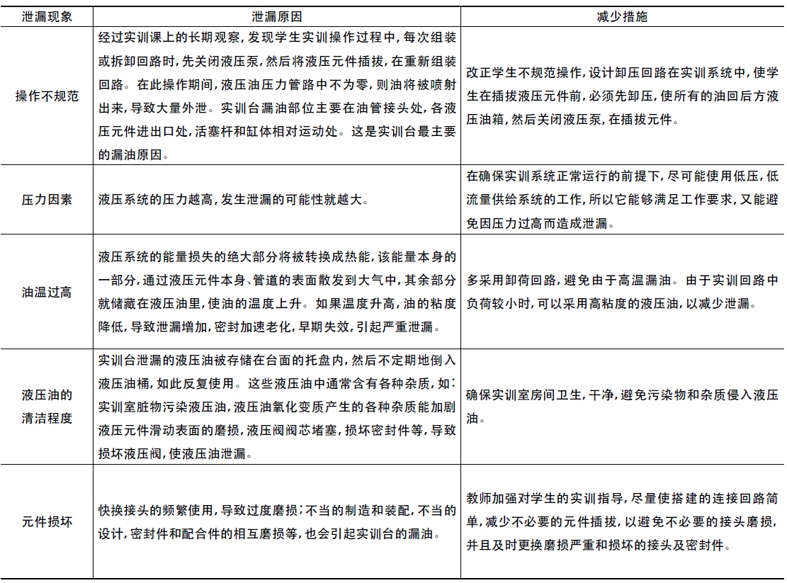 學(xué)生使用實(shí)訓(xùn)臺的過程中,通過長時間的觀察,發(fā)現(xiàn)一個比較嚴(yán)重的問題: 當(dāng)學(xué)生完成實(shí)訓(xùn)后,油管的外壁覆蓋有液壓油,實(shí)訓(xùn)臺上的托盤內(nèi)充滿液壓油,有時在地面上也出現(xiàn)液壓油。這一現(xiàn)象,不僅污染實(shí)訓(xùn)室環(huán)境,影響了學(xué)生的安全,并且影響下一次實(shí)訓(xùn)的正常進(jìn)行,甚至?xí)绊懙綄W(xué)生動手操作的熱情。針對這一問題,我們進(jìn)行了深入分析。泄漏,通常是指在液壓系統(tǒng)正常工作的情況下,從液壓元件的密封間隙漏出少許油液的現(xiàn)象。液壓系統(tǒng)的泄漏,通常情況分為兩種: 外泄漏和內(nèi)泄漏。內(nèi)泄漏是指油液從液壓元件的高壓腔流向低壓腔,例如液壓傳動系統(tǒng)中液壓油從高壓腔向低壓腔的泄漏、換向閥內(nèi)壓力管道向回油管道的泄漏等; 外泄漏是指油液從系統(tǒng)內(nèi)部流到系統(tǒng)外部的泄漏,如齒輪泵的端面泄漏、液壓油管的滲透等。液壓實(shí)訓(xùn)臺泄漏分析及防漏辦法。