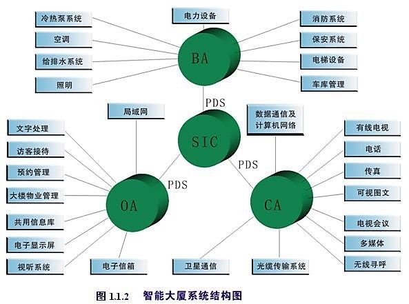 智能樓宇組成要素通常有三大基本要素,即樓宇自動化系統(tǒng)(bas,building automation system)、通信自動化系統(tǒng)(cas,communication automation system)和辦公自動化系統(tǒng)(oas,office automation system)。通常人們把它們稱為了3a。這三者是有機結(jié)合的,建筑環(huán)境是智能樓宇基本組成要素的支持平臺。為實施3a系統(tǒng),需借助結(jié)構(gòu)化綜合布線系統(tǒng),即pds(premsies distribution system)。如圖1-2所示。