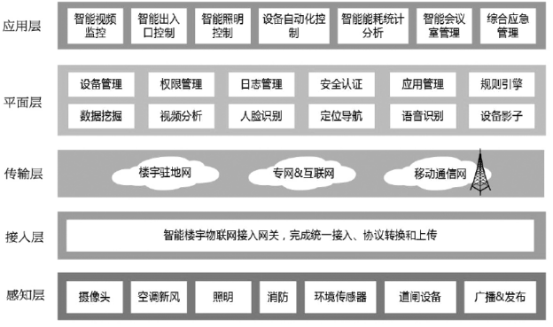 基于物聯(lián)網(wǎng)的智能樓宇綜合管理系統(tǒng)技術(shù)架構(gòu)如圖1所示。系統(tǒng)總共分為感知層、接入層、傳輸層、平臺層和應用層五個部分。感知層主要指接受智能樓宇系統(tǒng)統(tǒng)一管理的各種終端設施,包括動力設備(空調(diào)、新風、排風、排水、電梯等)、信息感知及采集設備(環(huán)境傳感器、音視頻設備)和控制設備等。傳輸層主要指由樓宇駐地網(wǎng)、互聯(lián)網(wǎng)(或?qū)>)及移動通信網(wǎng)組成的智能樓宇數(shù)據(jù)傳輸和通信管理網(wǎng)絡。