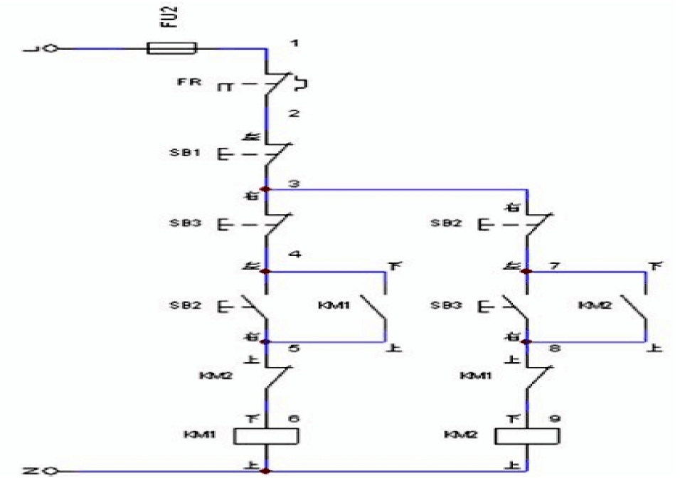 再次,做好原理圖節(jié)點(diǎn)標(biāo)注工作,可選取阿拉伯?dāng)?shù)字代表節(jié)點(diǎn),標(biāo)注時(shí)需遵循從上到下、由左往右的順序。如圖1,可選取三相異步電動(dòng)機(jī)正反轉(zhuǎn)復(fù)合互鎖控制電路的形式分析。如控制電路較為復(fù)雜,為確保節(jié)點(diǎn)標(biāo)注的正確性,需完成每次標(biāo)注后,需對(duì)2個(gè)相近節(jié)點(diǎn)間觸點(diǎn)是否存在問題進(jìn)行分析,如存在重復(fù)標(biāo)注節(jié)點(diǎn)狀況,需及時(shí)做好修正工作。
