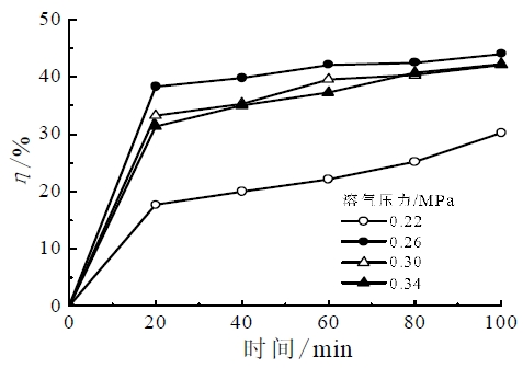 溶氣壓力是氣浮工藝中一個(gè)重要操作參數(shù),首先采用不同溶氣壓力進(jìn)行除油實(shí)驗(yàn),分析其對(duì)除油率的影響。實(shí)驗(yàn)采用污水初始含油濃度為1000mg/L,溶氣壓力分別為0.22、0.26、0.30、0.34MPa。不同溶氣壓力下除油率隨時(shí)間變化如圖1 所示。由圖1 可知,0至20min除油率變化最顯著, 20min以后除油率增大速率減緩,60min后除油率基本不再發(fā)生改變。溶氣壓力由0.22MPa增大至0.26MPa時(shí),最終除油率由30%左右升高至40%以上。而溶氣壓力在0.26MPa至0.34MPa變化時(shí),最終除油率基本不再發(fā)生改變。在實(shí)際應(yīng)用中,提高溶氣壓力伴隨著能耗的增加,但分離效率不再增大,所以實(shí)際操作過(guò)程中溶氣壓力并非越大越好,需確定最合理的溶氣壓力。