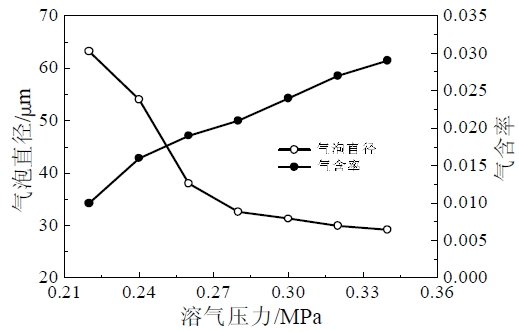 圖2 溶氣壓力對(duì)氣泡直徑及氣含率的影響