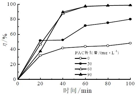 不同濃度聚合氯化鋁(PAC,分析純)對(duì)除油率變化的影響如圖3所示。加入30mg/L聚合氯化鋁,除油率明顯提高,PAC投加量增大至60mg/L時(shí),最終除油率達(dá)到98%以上,繼續(xù)增大PAC投加量無(wú)法進(jìn)一步提高除油效率。
