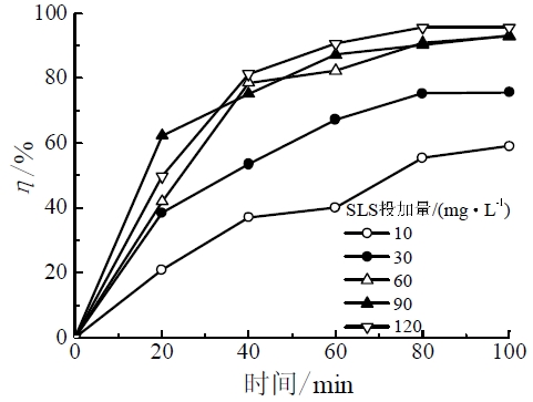 不同表面活性劑十二烷基硫酸鈉(SLS,分析純)濃度下除油效率隨時(shí)間的變化趨勢(shì)見圖4。由圖4 可知,隨SLS質(zhì)量濃度由10mg/L增大至60mg/L,最終除油率由60%左右提高到90%以上。此后,除油效率不再隨SLS濃度的增大而提高。