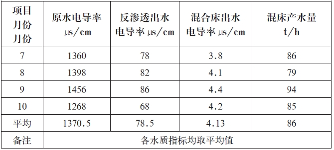 反滲透出水經(jīng)陰陽離子交換器處理,將出水電導(dǎo)率控制在20μs/cm以下后進入混合離子交換器進行二次脫鹽,最后生產(chǎn)出電導(dǎo)率<5μs/cm的除鹽水。