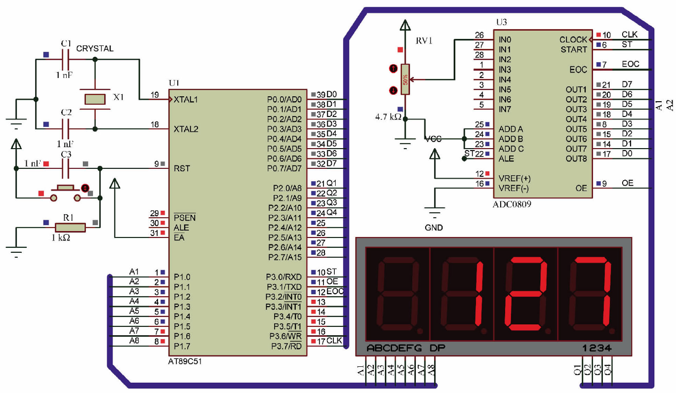 ADC0809有8路獨立的模擬量輸入端,本實驗僅需要使用其中一路,芯片相關(guān)的控制信號如START、EOC、OE、CLK等,都連接到單片機相應(yīng)的管腳上接受程序控制。當單片機配置完成,ADC0809啟動轉(zhuǎn)換信號到來后,就開始進行模擬量到數(shù)字量的轉(zhuǎn)換,輸入0~5V的模擬量分別對應(yīng)著0~255的數(shù)字量,轉(zhuǎn)換結(jié)果由4個數(shù)碼管顯示。
