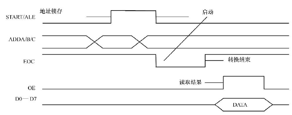 2)代碼調(diào)試。本實驗設(shè)計的代碼調(diào)試包括AD轉(zhuǎn)換和數(shù)碼管動態(tài)顯示2個部分,鑒于篇幅所限,下面重點分析AD轉(zhuǎn)換部分。AD轉(zhuǎn)換的時序如圖3所示。首先,輸入3位地址,并使ALE為高電平,將地址存入地址鎖存器中,經(jīng)地址譯碼器譯碼后,從8路模擬通道中選通一路將模擬量送到比較器。然后送START一個高脈沖,START的上升沿使逐次逼近寄存器復(fù)位,下降沿啟動A/D轉(zhuǎn)換,并使EOC信號為低電平。當轉(zhuǎn)換結(jié)束時,轉(zhuǎn)換的結(jié)果送入到三態(tài)輸出鎖存器,并使EOC信號回到高電平,通知單片機轉(zhuǎn)換結(jié)束。最后,當單片機執(zhí)行讀數(shù)據(jù)指令時,使OE為高電平,則從輸出端D0—D7讀出數(shù)據(jù)。