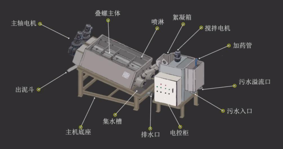 4.堆垛式污泥脫水器:過(guò)濾體由堆垛式定環(huán)和螺旋軸線(xiàn)穿過(guò)的動(dòng)環(huán)組成。濾液從固定環(huán)和活動(dòng)環(huán)形成的過(guò)濾接頭排出,泥餅從脫水部末端排出。