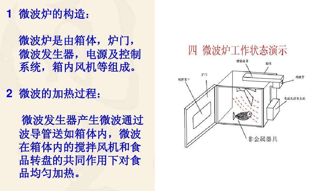 1.微波爐利用了微波加熱,微波是一種電磁波,它的頻率為300~300GHZ,微波可以被富含水分的蛋白質(zhì)、脂肪物質(zhì)吸收,電磁能量轉(zhuǎn)變?yōu)闊崮埽訜岬奈矬w通常有無(wú)極性分子電介質(zhì)和有極性分子電介質(zhì)兩種物質(zhì)。