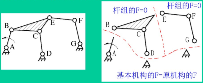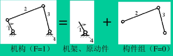 因為機構(gòu)具有確定運動的條件:原動件數(shù)=F,所以如將機構(gòu)的機架和原動件(稱為基本機構(gòu))與其余構(gòu)件拆分開,則由其余構(gòu)件構(gòu)成的構(gòu)件組的F=0。