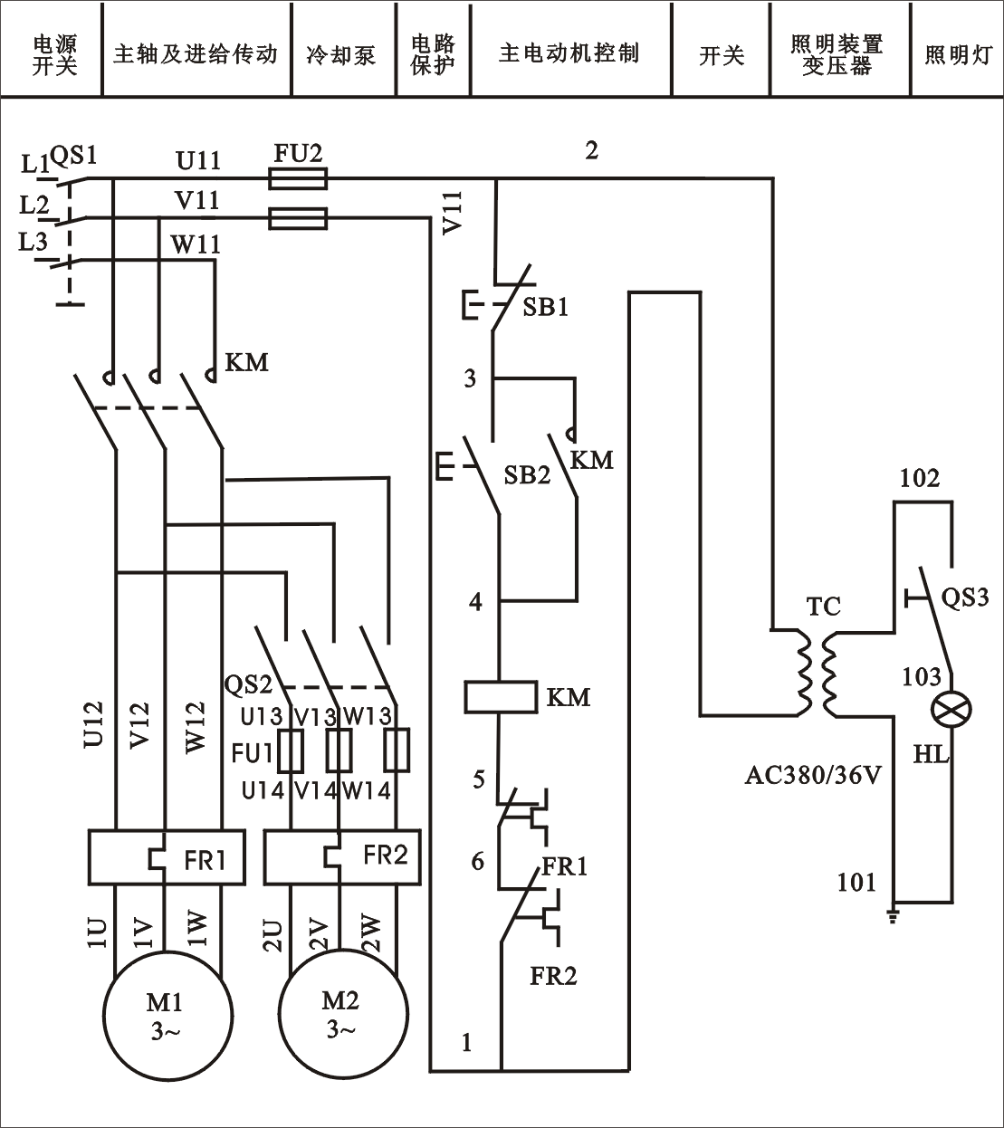 接觸器KM的線圈通電而鐵心吸合,主回路中接觸器KM的三個(gè)常開觸頭合上,主電機(jī)M1得到三相交流電而起動(dòng)運(yùn)轉(zhuǎn),同時(shí)接觸器KM的常開輔助觸頭也合上,對(duì)控制回路進(jìn)行自鎖,保證起動(dòng)按鈕SB2松開時(shí),接觸器KM的線圈 仍然通電。若加工時(shí)需要冷卻,則撥動(dòng)開關(guān)QS2,讓冷卻泵電動(dòng)機(jī)M2通電運(yùn)轉(zhuǎn),帶動(dòng)冷卻泵供應(yīng)冷卻液。