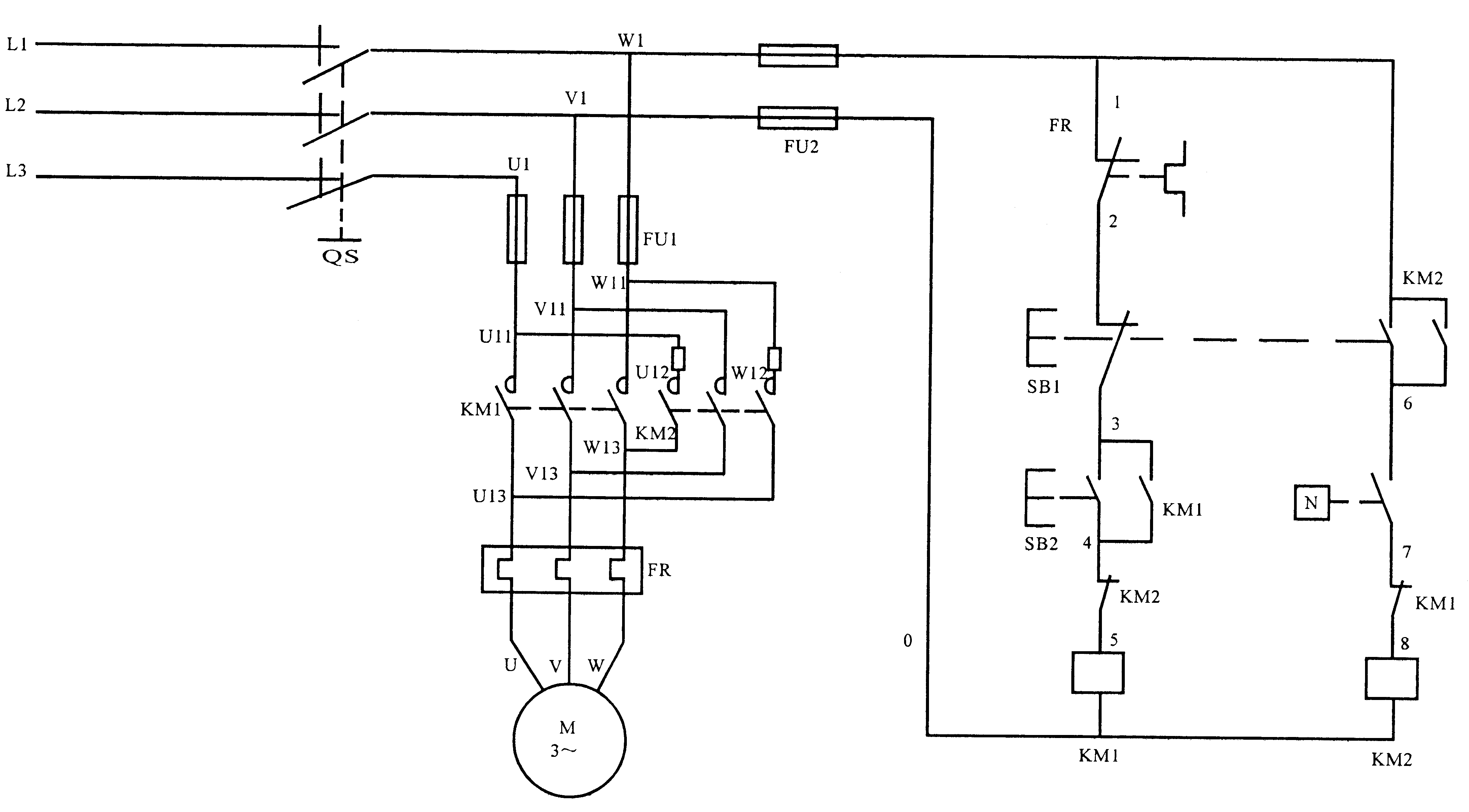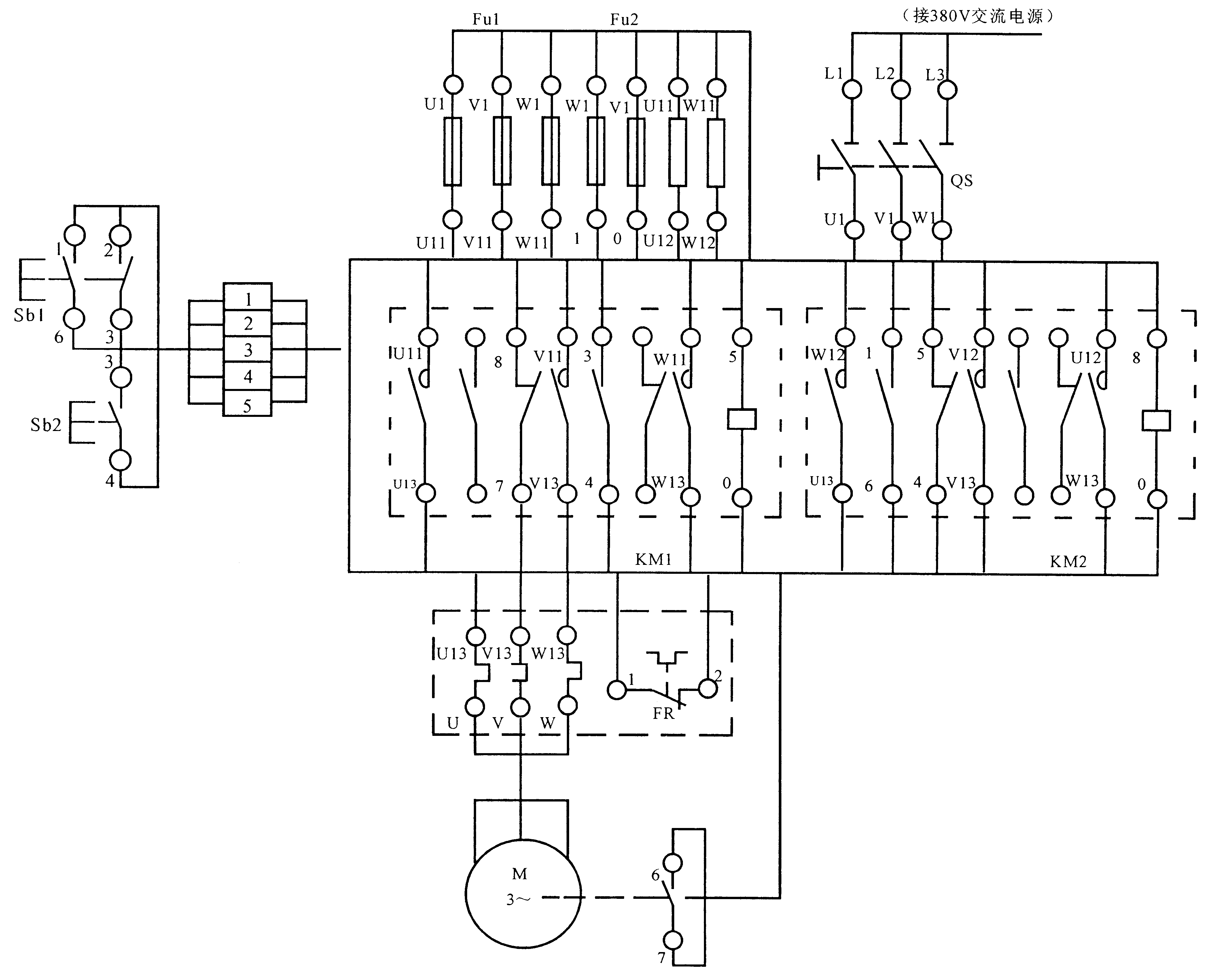 圖中按下SB2后KM1線圈得電吸合,電機(jī)正轉(zhuǎn)啟動(dòng),速度達(dá)到一定值后速度繼電器常開觸點(diǎn)6——7閉合,為反接制動(dòng)做準(zhǔn)備。要反接制動(dòng)時(shí),按下SB1按鈕,KM1線圈失電,同時(shí)KM2線圈因SB1常開觸點(diǎn)閉合而得電,電機(jī)串入電阻R1,R2反接制動(dòng),速度降到一定值時(shí),速度繼電器恢復(fù)常開,KM2線圈失電,制動(dòng)結(jié)束。