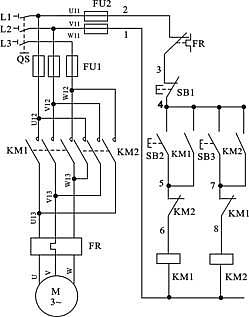 (2)反轉(zhuǎn)控制  要使電動機改變轉(zhuǎn)向(即由正轉(zhuǎn)變?yōu)榉崔D(zhuǎn))時,應先按下停止按鈕SB1,使正轉(zhuǎn)控制電路斷開,電動機停轉(zhuǎn),然后才能使電動機反轉(zhuǎn),為什么要這樣操作呢?因為反轉(zhuǎn)控制回路中串聯(lián)了正轉(zhuǎn)接觸器KM1的常閉觸頭。當KM1通電工作時,它是斷開的,若這時直接按反轉(zhuǎn)按鈕SB3,反轉(zhuǎn)接觸器KM2是無法通電的,