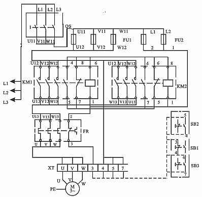 仔細檢查確認接線無誤后,接通交流電源,按下SB2,電機應正轉(zhuǎn)(電機右側(cè)的軸伸端為順時針轉(zhuǎn),若不符合轉(zhuǎn)向要求,可停機,換接電機定子繞組任意兩個接線即可)。按下SB3,電機仍應正轉(zhuǎn)。如要電機反轉(zhuǎn),應先按SB1,使電機停轉(zhuǎn),然后再按SB3,則電機反轉(zhuǎn)。若不能正常工作,則應分析并排除故障,使線路能正常工作。