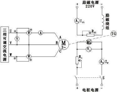 (2)按圖6-3接線,圖中M用編號(hào)為DQ10的三相鼠籠式異步電動(dòng)機(jī),額定電壓:220V,△接法。MG用編號(hào)為DQ19的校正直流測(cè)功機(jī)。S選用DQ31掛箱上的對(duì)應(yīng)開關(guān),并將S斷開。R1選用DQ29的180Ω阻值加上DQ27上四只900Ω串聯(lián)再加兩只900Ω并聯(lián)共4230Ω阻值,Rf1選用DQ29上1800Ω阻值。