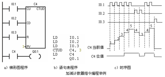 在加計數(shù)脈沖輸入CU的上升沿,計數(shù)器的當(dāng)前值加1,在減計數(shù)脈沖輸入CD的上升沿,計數(shù)器的當(dāng)前值減1,當(dāng)前值大于等于設(shè)定值PV時,計數(shù)器位被置位。若復(fù)位輸入R為ON時或?qū)τ嫈?shù)器執(zhí)行復(fù)位指令R時,計數(shù)器被復(fù)位 |