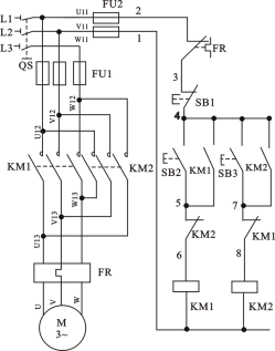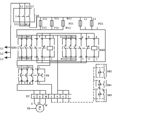 仔細(xì)檢查確認(rèn)接線無(wú)誤后,接通交流電源,按下SB2,電機(jī)應(yīng)正轉(zhuǎn)(電機(jī)右側(cè)的軸伸端為順時(shí)針轉(zhuǎn),若不符合轉(zhuǎn)向要求,可停機(jī),換接電機(jī)定子繞組任意兩個(gè)接線即可)。按下SB3,電機(jī)仍應(yīng)正轉(zhuǎn)。如要電機(jī)反轉(zhuǎn),應(yīng)先按SB1,使電機(jī)停轉(zhuǎn),然后再按SB3,則電機(jī)反轉(zhuǎn)。若不能正常工作,則應(yīng)分析并排除故障,使線路能正常工作。