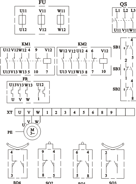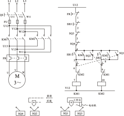 圖中的SQ3和SQ4分別安裝向右或向左的某個極限位置上。如果SQ1或SQ2失靈時,工作臺會繼續(xù)向右或向左運動,當工作臺運行到極限位置時,撞塊就會碰撞SQ3和SQ4,從而切斷控制線路,迫使電動機M停轉(zhuǎn),工作臺就停止移動。SQ3和SQ4這里實際上起終端保護作用,因此稱為終端保護開關(guān)或簡稱終端開關(guān)。