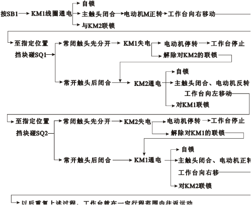 按SB1,觀察并調(diào)正電動機M為正轉(zhuǎn)(模擬工作臺向右移動),用手代替檔塊按壓SQ1,電動機先停轉(zhuǎn)再反轉(zhuǎn),即可使SQ1自動復位(反轉(zhuǎn)模擬工作臺向左移動);用手代替檔塊按壓SQ2再使其自動復位,則電機先停轉(zhuǎn)再正轉(zhuǎn)。以后重復上述過程,電機都能正常正反轉(zhuǎn)。若撥動SQ3或SQ4極限位置開關(guān)則電機應(yīng)停轉(zhuǎn)。若不符合上述控制要求,則應(yīng)分析并排除故障。
