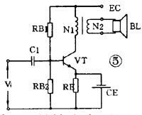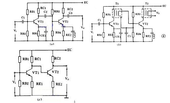這個圖中,晶體管真正的輸入是 V i 和 V o 的差值,所以這是一個交流負反饋很深的電路。由于很深的負反饋,這個電路的特點是:電壓放大倍數(shù)小于 1 而接近 1 ,輸出電壓和輸入電壓同相,輸入阻抗高輸出阻抗低,失真小,頻帶寬,工作穩(wěn)定。它經(jīng)常被用作放大器的輸入級、輸出級或作阻抗匹配之用。 ( 4 )低頻放大器的耦合 一個放大器通常有好幾級,級與級之間的聯(lián)系就稱為耦合。放大器的級間耦合方式有三種: ①RC 耦合,見圖 4 ( a )。優(yōu)點是簡單、成本低。但性能不是最佳。 ② 變壓器耦合,見圖 4 ( b )。優(yōu)點是阻抗匹配好、輸出功率和效率高,但變壓器制作比較麻煩。 ③ 直接耦合,見圖 4 ( c )。優(yōu)點是頻帶寬,可作直流放大器使用,但前后級工作有牽制,穩(wěn)定性差,設(shè)計制作較麻煩。 功率放大器