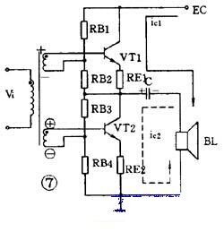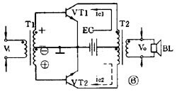圖 5 是單管功率放大器, C1 是輸入電容, T 是輸出變壓器。它的集電極負載電阻 Ri′ 是將負載電阻 R L 通過變壓器匝數(shù)比折算過來的: RC′= ( N1 N2 ) 2 RL=N 2 RL 負載電阻是低阻抗的揚聲器,用變壓器可以起阻抗變換作用,使負載得到較大的功率。 這個電路不管有沒有輸入信號,晶體管始終處于導(dǎo)通狀,靜態(tài)電流比較大,困此集電極損耗較大,效率不高,大約只有 35 %。這種工作狀態(tài)被稱為甲類工作狀態(tài)。這種電路一般用在功率不太大的場合,它的輸入方式可以是變壓器耦合也可以是 RC 耦合。 ( 2 )乙類推挽功率放大器 圖 6 是常用的乙類推挽功率放大電路。它由兩個特性相同的晶體管組成對稱電路,在沒有輸入信號時,每個管子都處于截止狀態(tài),靜態(tài)電流幾乎是零,只有在有信號輸入時管子才導(dǎo)通,這種狀態(tài)稱為乙類工作狀態(tài)。當輸入信號是正弦波時,正半周時 VT1 導(dǎo)通 VT2 截止,負半周時 VT2 導(dǎo)通 VT1 截止。兩個管子交替出現(xiàn)的電流在輸出變壓器中合成,使負載上得到純正的正弦波。這種兩管交替工作的形式叫做推挽電路。