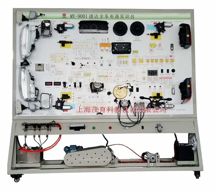 燈光系統(tǒng)、儀表系統(tǒng)、點火與噴射系統(tǒng)、起動系統(tǒng)、充電系統(tǒng)、發(fā)動機電控系統(tǒng)、喇叭系統(tǒng)、電動車窗系統(tǒng)、電控門鎖及后視鏡系統(tǒng)、雨刮系統(tǒng)、音響系統(tǒng)、故障設置系統(tǒng)、移動臺架等。
