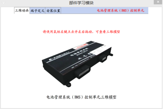 結(jié)構(gòu)認知功能:三維模型對動力電池系統(tǒng)的每個零部件(包括:動力電池組總成、BMS、電池包、電池上殼體)等部件進行專業(yè)術(shù)語標識,可任意控制虛擬現(xiàn)實3D仿真系統(tǒng)中虛擬攝像機,對任意視角的控制------觀察物體局部、拉近、圍繞物體旋轉(zhuǎn),可進行結(jié)構(gòu)認知教學(xué)。