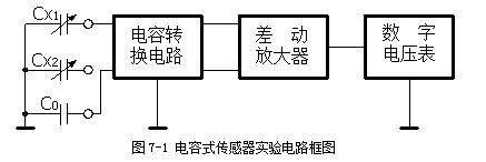 1、實驗電路框圖如圖7-1所示。電容的變化通過電容轉換電路轉換成電壓信號,經過差動放大器放大后,用數(shù)字電壓表顯示出來。
