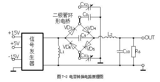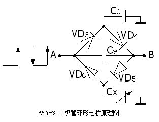 2、圖7-1中的電容轉換電路圖如圖7-2所示。圖中的信號發(fā)生器用于產生方波信號。電容轉換由二極管環(huán)形電橋完成,二極管環(huán)電橋工作原理如圖7-3所示。