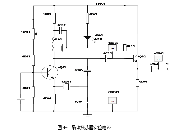 晶體振蕩器電路如圖4-2所示。圖中,4R03、4C02為去耦元件,4C01為旁路電容,并構(gòu)成共基接法。4W01用以調(diào)整振蕩器的靜態(tài)工作點(diǎn)(主要影響起振條件)。4C05為輸出耦合電容。4Q02為射隨器,用以提高帶負(fù)載能力。實(shí)際上,圖4-2電路的交流通路即為圖4-1所示的電路。