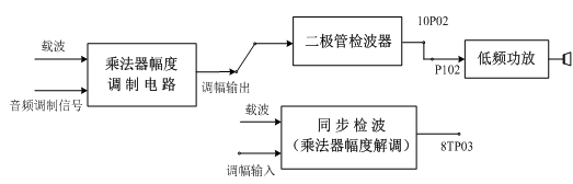 。在解調(diào)信號(hào)不失真的情況下,將10K02撥至右側(cè),示波器CH2接10TP04,可觀察到放大后音頻信號(hào),調(diào)節(jié)10W03音頻幅度會(huì)發(fā)生變化。