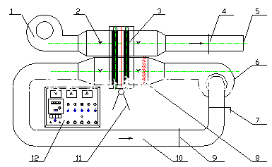 1.冷端風機 2.測溫點3. 熱管組4.笛形管5.風量調(diào)節(jié)6.熱風機7.熱風調(diào)節(jié)8.電加熱器組9. 笛形管10.熱風循環(huán)管道 11工作臺旋轉(zhuǎn)臺12.儀表盤