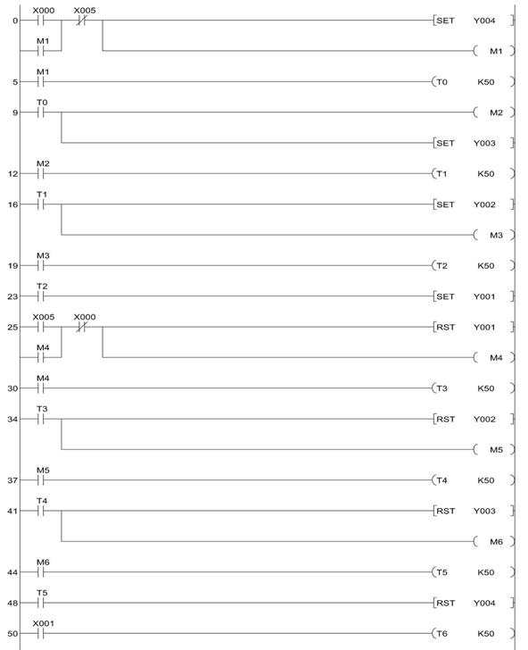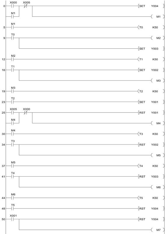 0 LD X000 1 OR M1 2 ANI X005 3 SET Y004 4 OUT M1 5 LD M1 6 OUT T0 K50 9 LD T0 10 OUT M2 11 SET Y003 12 LD M2 13 OUT T1 K50 16 LD T1 17 SET Y002 18 OUT M3 19 LD M3 20 OUT T2 K50 23 LD T2 24 SET Y001 25 LD X005 26 OR M4 27 ANI X000 28 RST Y001 29 OUT M4 |