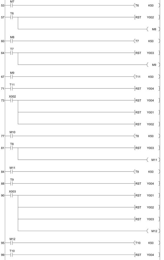 27 ANI X000 28 RST Y001 29 OUT M4 30 LD M4 31 OUT T3 K50 34 LD T3 35 RST Y002 36 OUT M5 37 LD M5 38 OUT T4 K50 41 LD T4 42 RST Y003 43 OUT M6 44 LD M6 45 OUT T5 K50 48 LD T5 49 RST Y004 50 LD X001 51 RST Y004 52 OUT M7 53 LD M7 |