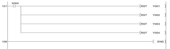 83 OUT M11 84 LD M11 85 OUT T9 K50 88 LD T9 89 RST Y004 90 LD X003 91 RST Y001 92 RST Y002 93 RST Y003 94 OUT M12 95 LD M12 96 OUT T10 K50 99 LD T10 100 RST Y004 101 LD X004 102 RST Y001 103 RST Y002 104 RST Y003 105 RST Y004 106 END |