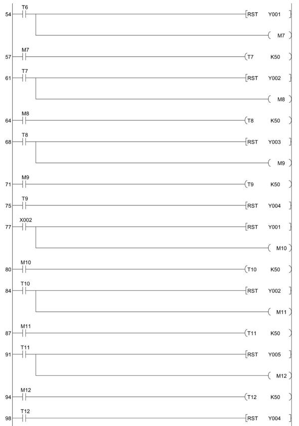 64 LD M8 65 OUT T8 K50 68 LD T8 69 RST Y003 70 OUT M9 71 LD M9 72 OUT T9 K50 75 LD T9 76 RST Y004 77 LD X002 78 RST Y001 79 OUT M10 80 LD M10 81 OUT T10 K50 84 LD T10 85 RST Y002 86 OUT M11 87 LD M11 88 OUT T11 K50 91 LD T11 92 RST Y005 93 OUT M12 94 LD M12 95 OUT T12 K50 |