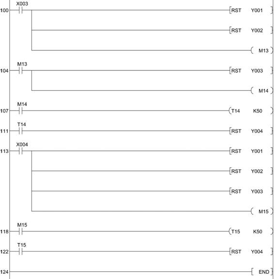 98 LD T12 99 RST Y004 100 LD X003 101 RST Y001 102 RST Y002 103 OUT M13 104 LD M13 105 RST Y003 106 OUT M14 107 LD M14 108 OUT T14 K50 111 LD T14 112 RST Y004 113 LD X004 114 RST Y001 115 RST Y002 116 RST Y003 117 OUT M15 118 LD M15 119 OUT T15 K50 122 LD T15 123 RST Y004 124 END |